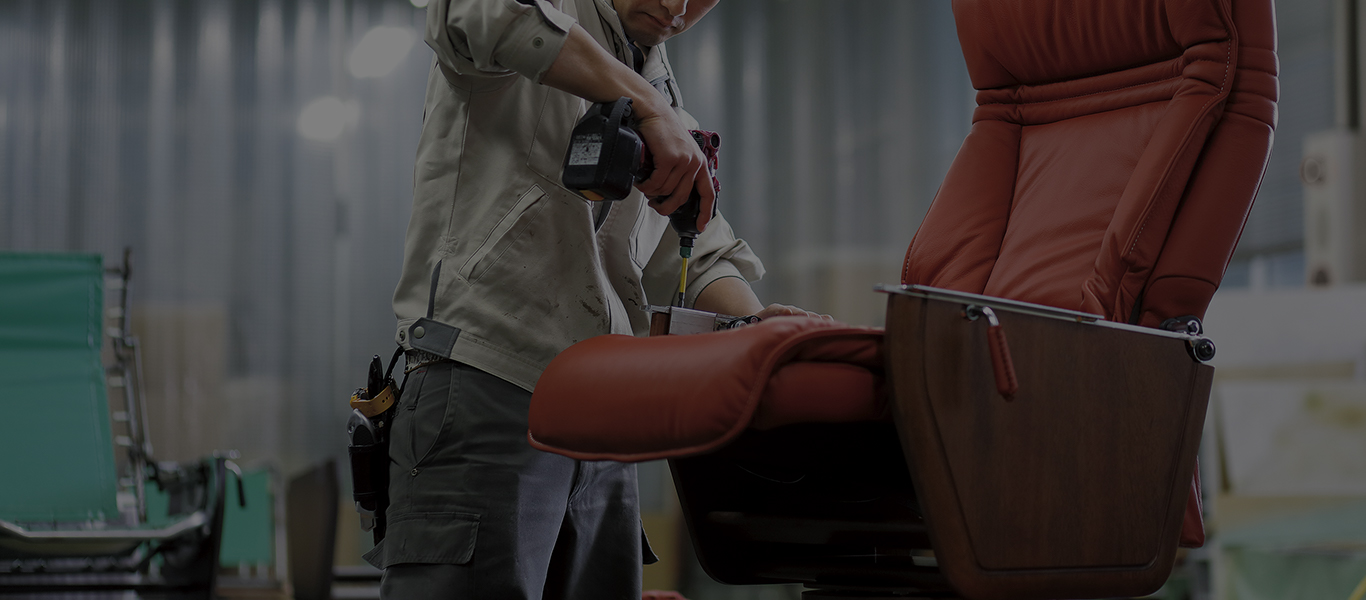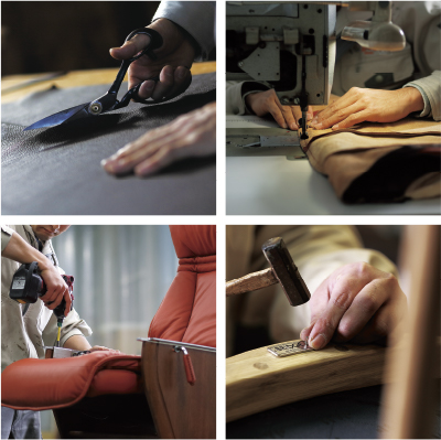 吉川工場ではTribunaの製造や、古い北欧家具のリペアなどを行っています。革の裁断・縫製、木工など、専門技術を追求する職人たちが、1点1点の家具にじっくり向き合う姿がここにあります。